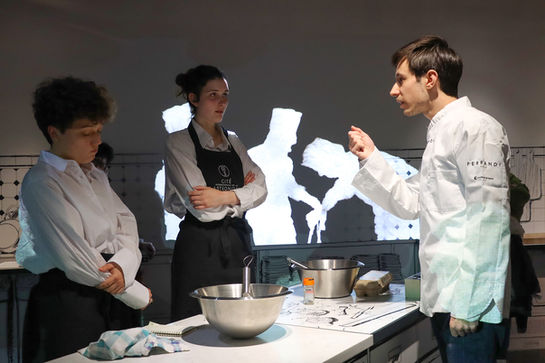 Cette aventure a tout d'abord commencé avec un gros travail d'écriture. L'objectif était de raconter l'histoire du restaurant d'une manière un petit peu inédite. Nos pépins ont donc eu l'idée de raconter cette histoire à travers les grandes figures de la gastronomie française (Bocuse, Mathurin Roze, Auguste Escoffier, la Mère Brazier etc...), le tout mené par un visiteur du futur qui emmène le public dans différentes époques.